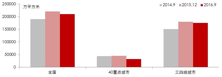 2015年12月在北京举行的中央经济工作会议明确将“去库存”列为2016年经济工作的五大任务之一。到2016年10月,20多个热点城市迎来密集调控,标志着楼市政策出现转向。因此,我们选取上述三个关键节点(2014年9月,2015年12月,2016年9月),对比全国及重点城市的库存变化。