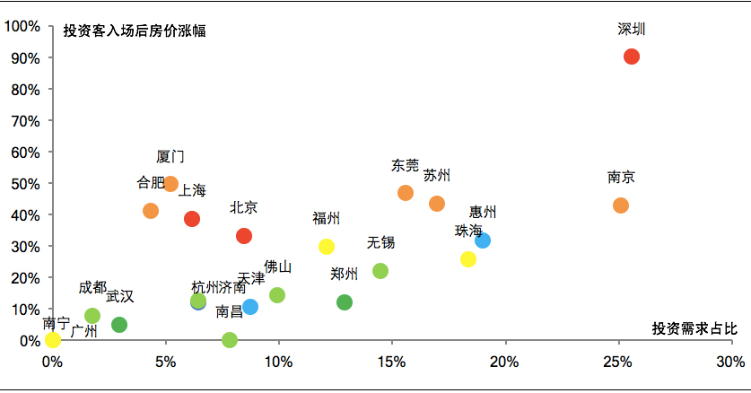 在政策急速转向后,投资需求离场,短期各城市的表现将主要受三个方面因素的影响:一是市场前期投资需求的占比;二是投资需求入场后对房价推高的程度;三是政策执行的严厉程度。