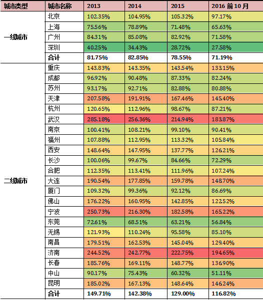 我们用2009年以来各城市累计出让的住宅用地可建面积,与同期新建住宅的销售面积相比,可以得到表示各城市土地存量的指标。