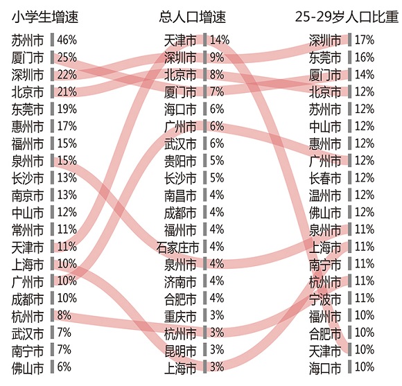 以往研究者指出,相对比总人口的抽样数据,使用小学生数量这一指标更能反映一个城市的人口增速状况,因此,我们将综合考虑小学生增速、总人口增速以及25-29岁人口比重,来衡量各个重点城市的人口状况,从一个更为综合、全面的角度预测房地产市场的长期走势。下图分别呈现的是在这三个指标上排名靠前的20个城市,并且将在这三项排名上均进入前20名的城市用红色线相连,线越平缓,表示该城市的优势越均衡;线越弯曲,表示该城市优势越不均衡。