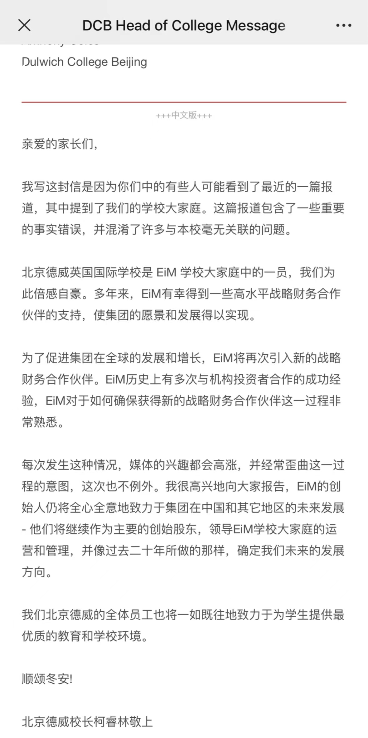 德威在邮件中称,将继续实行学校的管理运营,一部分股东将退出,也有新股东加入,但未透露资方具体名称,仅表示其对“确保获得新的战略财务合作伙伴”这一过程非常熟悉。