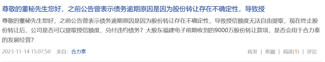 有投资者在互动意向合力泰提问,之前公司表示债务逾期是因为大股东转让控制权导致未使用的授信额度被限制使用,现在交易终止了,是否可以使用授信额度兑付债务?但截至发稿,合力泰董秘尚未给予回复。