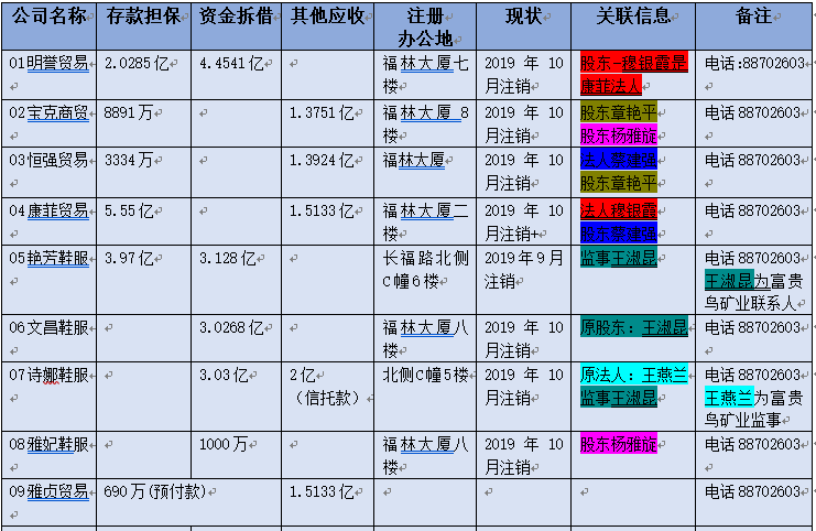 不仅是登记电话一致,在人员方面,8家商贸公司之间,以及与富贵鸟的明面关联公司之间,也存在多重交集,如: