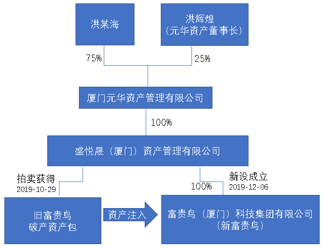 元华资产2016年起的股东是自然人洪某海占股75%,自然人洪辉煌占股25%,同时由洪辉煌担任董事长。2019年10月25日,也就是富贵鸟资产拍卖之前四天,洪辉煌把元华资产25%的股权转让给了鑫东森控股。但这只是一次股权关系整理,不代表洪辉煌放弃了与富贵鸟破产资产包的关联。
