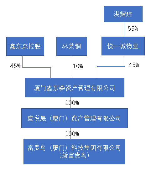 因此,在富贵鸟的资产拍卖两个月后(2019年12月23日),到2020年8月28日(悦一诚将鑫东森资产的45%股权转让给鑫东森控股)之前,洪辉煌实际是新富贵鸟的第一大股东(并列),具体控股情况可见以下关系图。