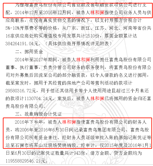 法院认定,林和狮作为富贵鸟股份财务的主管,指使财务人员将富贵鸟十年间的原始记账凭证运到石狮市将军山垃圾场焚烧销毁。