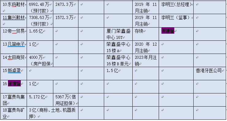 其中,前8家注册在石狮的商贸公司(01明誉贸易、02宝克商贸、03恒强贸易、04康菲贸易、05艳芳鞋服、06文昌鞋服、07诗娜鞋服、08雅妃鞋服),从富贵鸟体系,套出了合计超过30亿元资金。