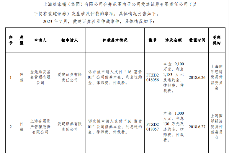 到2023年10月为止,已有11家金融机构把爱建证券推上了仲裁法庭,合计诉求金额超过8个亿。