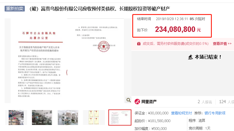 2019年8月23日,福建泉州中院裁定富贵鸟股份破产,富贵鸟的商标等无形资产、存货、应收账款、股权投资等被打包放到阿里司法拍卖平台上。这些资产经历两次流拍之后,2019年10月29日,第三次起拍价降到了1.81亿元。这一次出现了两家争夺者,从上午9点53分开始,一直争抢到了中午12点31分,经过85次竞价,最终以2.34亿元的价格成交,比起拍价高出了超过5000万元。