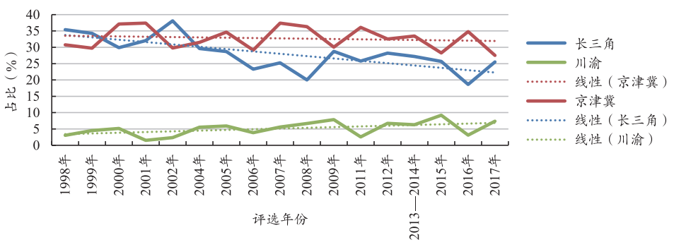 长三角地区、京津冀地区、川渝地区高层次人才数量全国占比历年变化/东部地区高层次人才占比逐渐下降,而西部地区占比逐渐增加
