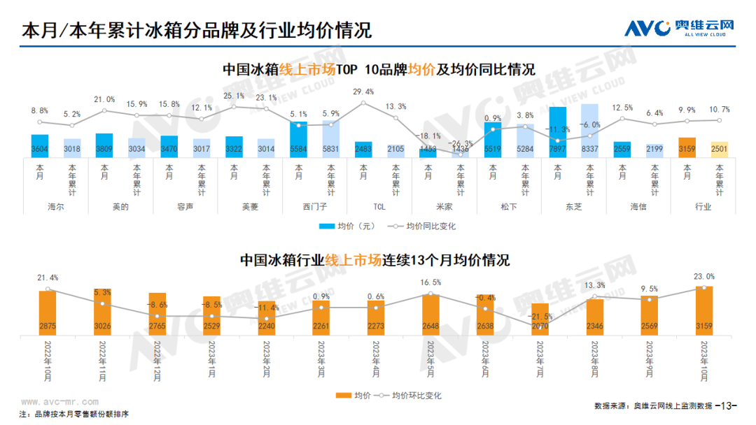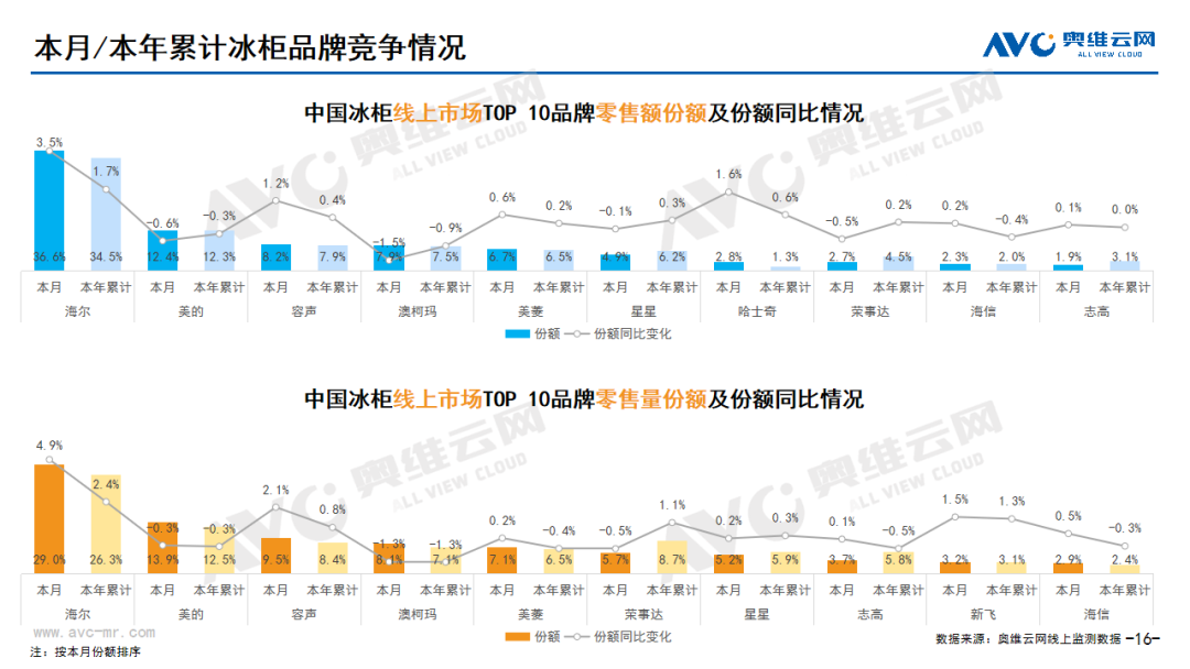 白电:据奥维云网(AVC)线上市场监测数据显示,本月白电各品类中,冰箱、冰柜、洗衣机、独立式干衣机和空调线上零售额规模同比分别为10.6%、-18.6%、-2.1%、-28.2% 和25.9%;冰箱、冰柜、洗衣机、独立式干衣机和空调的均价分别为3159元、1300元、1770元、3602元和3164元,同比分别为9.9%、8.8%、4.1%、22.3% 和-0.2%;各品类中,高端品零售额占比分别为6.2%、7.3%、0.8%、13.9% 和5.0%,同比分别为1.5%、1.5%、-0.1%、7.2% 和1.7%。