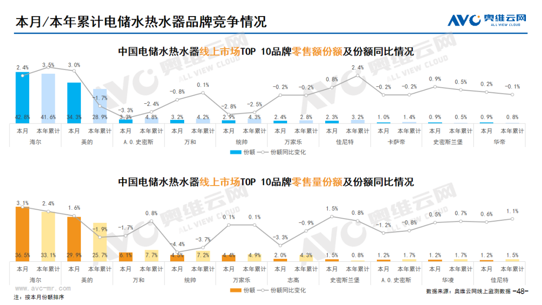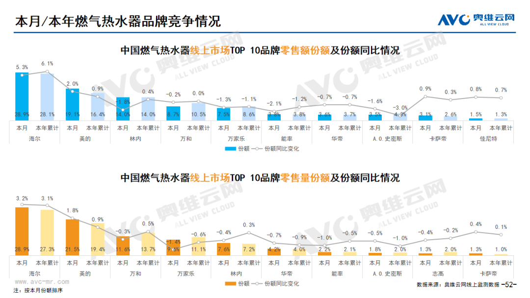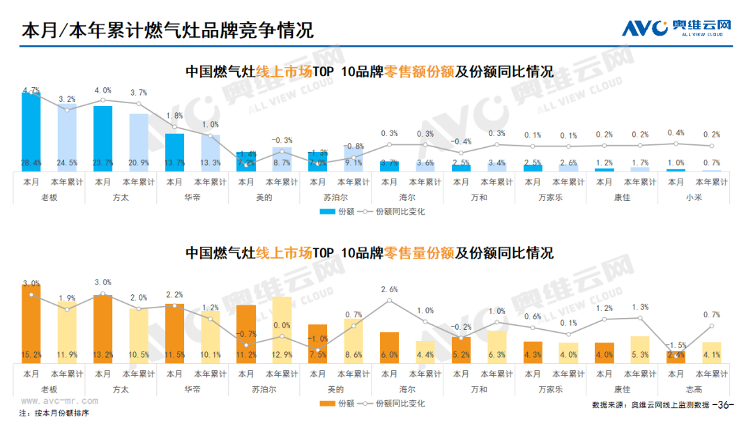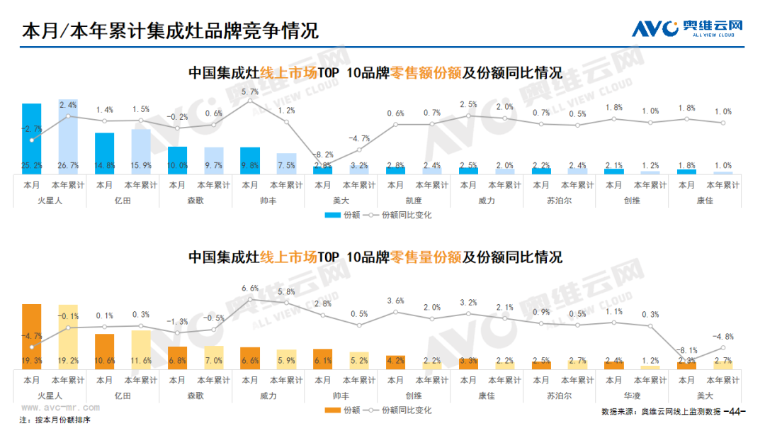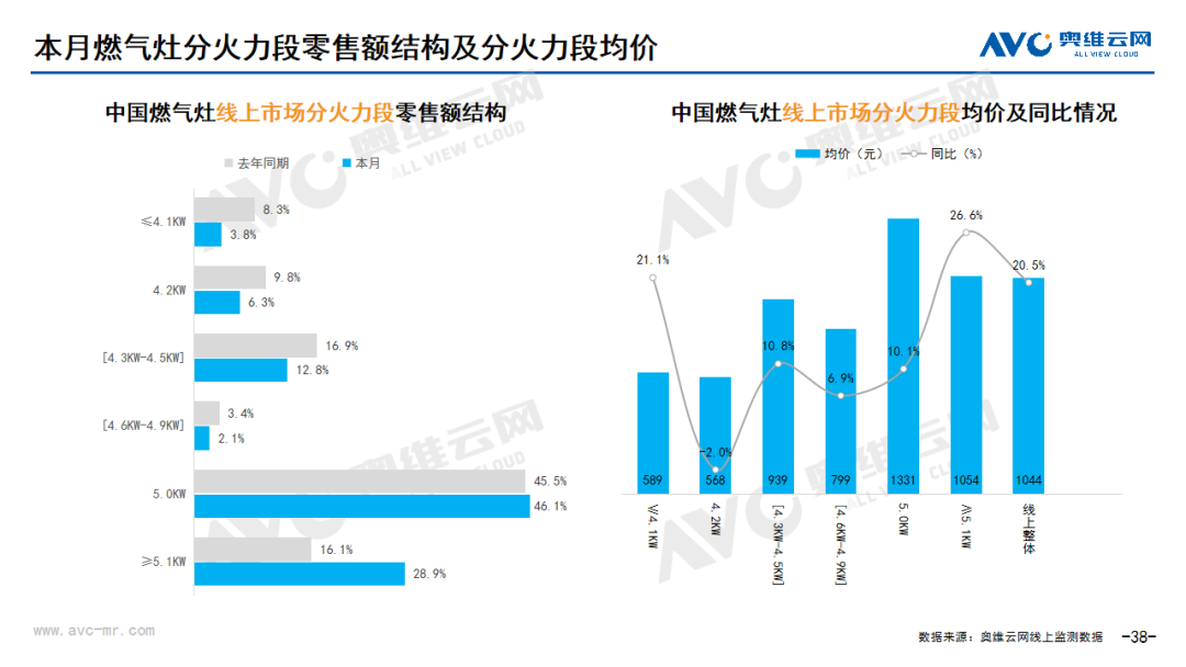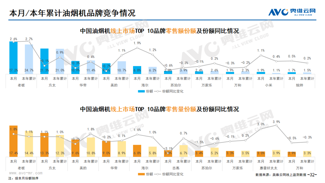 厨卫:据奥维云网(AVC)线上市场监测数据显示,本月厨卫主要品类中,油烟机、燃气灶、洗碗机、集成灶、电热和燃热的线上零售额规模同比分别为21.3%、17.7%、9.2%、-10.5%、29.9%和9.7%;油烟机、燃气灶、洗碗机、集成灶、电热和燃热的均价分别为1809元、1044元、5018元、7999元、1198元和1966元,同比分别为5.8%、20.5%、9.1%、-2.9%、15.9%和9.9%;各品类中,高端品零售额占比分别为0.8%、6.6%、11.7%、11.4%、1.2%和5.2%,同比分别为-0.2%、4.2%、0.0%、7.8%、0.5%和-0.1%。