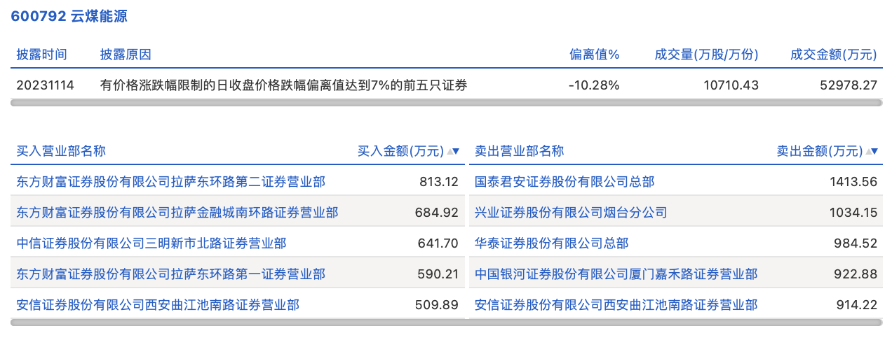 11月14日,云煤能源今日跌停,全天换手率达10.82%,振幅达5.72%。龙虎榜数据显示,营业部席位合计净卖出2029.49万元。其中,国泰君安证券总部、兴业证券烟台分公司分别卖出1413.56万元、1034.15万元;东方财富证券拉萨东环路第二证券营业部、东方财富证券拉萨金融城南环路证券营业部分别买入813.12万元、684.92万元。