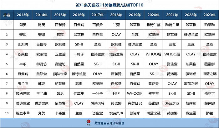 对日本排核废水的担忧,导致往年火热的日系美妆降至“冰点”。国际局势的变化,国货品牌的崛起,用户“消费降级”,同样使得相比欧美大牌,消费者逐渐更偏好国货品牌。今年天猫双11美妆类目排名前五的国际大牌里,据星图数据,欧莱雅、雅诗兰黛、兰蔻三大品牌下滑幅度分别为14.69%、24.42%、16.9%。日系两大品牌SK-II、资生堂也从前十掉至10名开外。