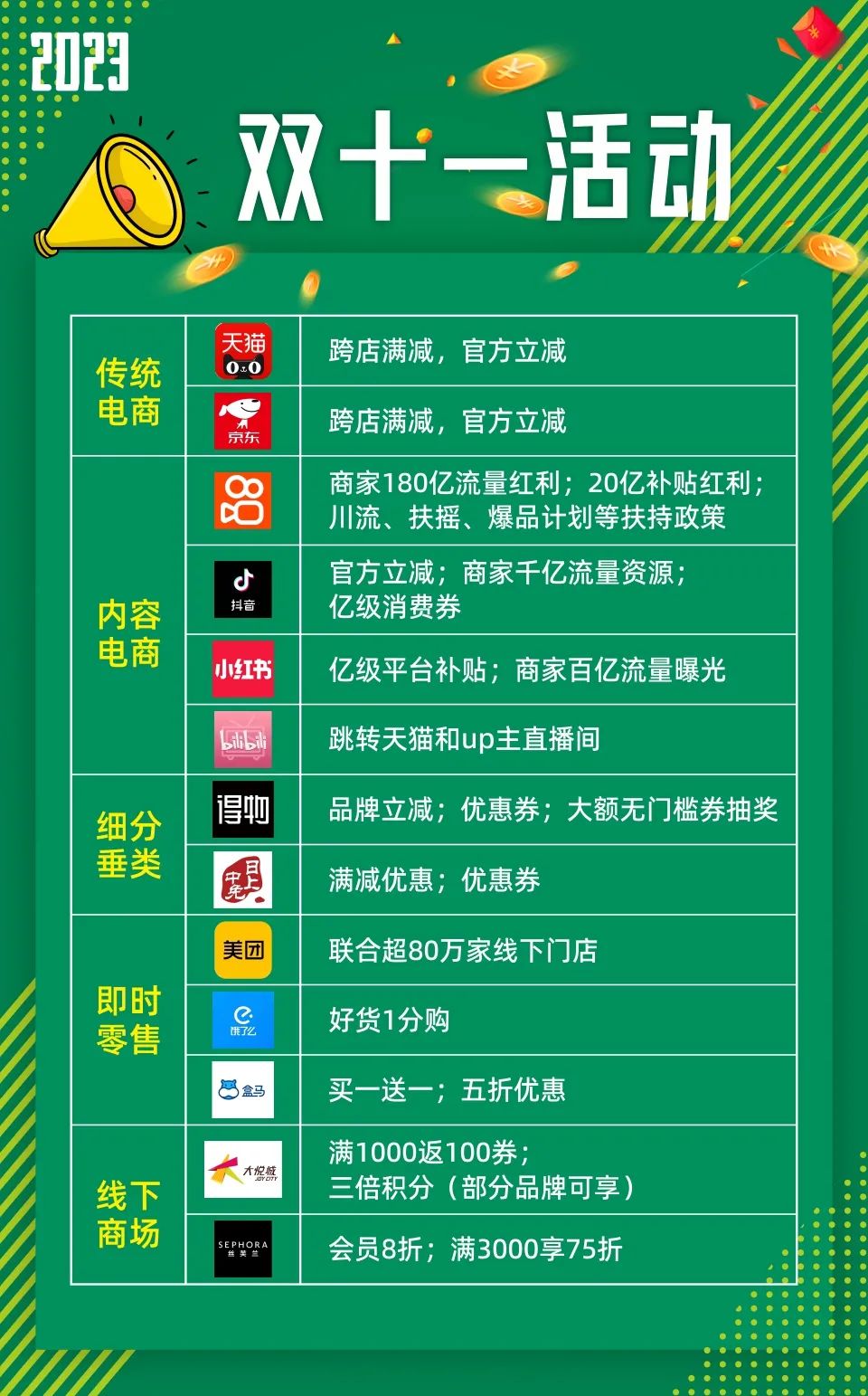 内容电商赛道也将双十一视为下半年最重要的营销活动纷纷拿出优惠机制,直观简单的“立减”成为内容电商的主要福利政策。快手拿出20亿补贴红利,直降政策买得简单;抖音主推官方立减,单品价格直降15%起,并提供亿级消费券。抖音也参与到本届双十一中来,但它们的关注点更在平台内商家的身上,小红书为促进商家在站内完成开店、种草、直播的闭环准备了亿级平台补贴、百亿流量曝光以及扶摇、爆品和铁粉计划等政策;B站一方面和天猫关联,将“会员购”入口改为“双11”入口跳转天猫;另一方面推荐页有双11选购攻略,还出现关注UP主的带货直播间。