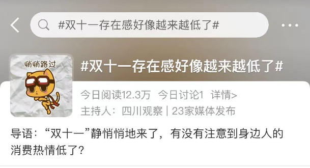 “今年双11变更静悄悄了”的话题登上了热搜,时过境迁,当消费者本身趋于理性时,双十一要是还坚持以前的玩法,路就会越走越窄,适时调整策略,才能让购物节焕发新生机。
