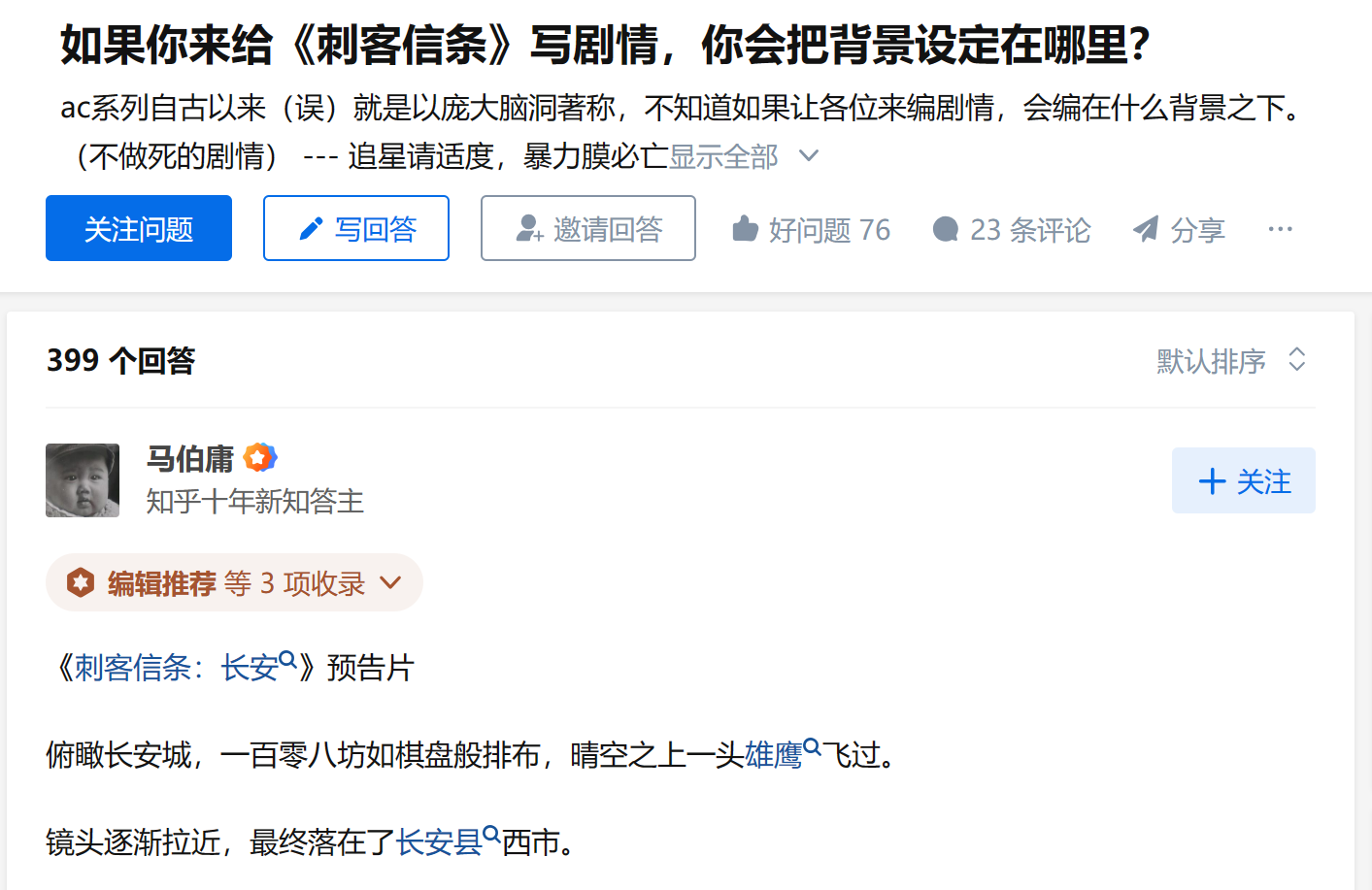 “如果你来给《刺客信条》写剧情,你会把背景设定在哪里?”,“俯瞰长安城,一百零八坊如棋盘般排布,晴空之上一头雄鹰飞过……”马伯庸写下的回答,正是日后《长安十二时辰》的灵感前身。