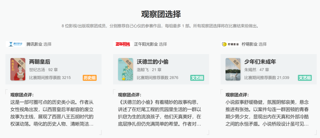 另外,两个平台的大赛都不约而同请到了影视公司和出版公司,为这类平台产出的通俗文学提供IP交易平台。豆瓣阅读的评委观察团邀请了正午阳光影业、爱奇艺等影视公司,知乎则请到了贾平凹、李敬泽等知名作家。