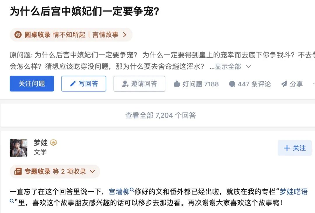 2020年,有人曾在知乎提问,“为什么后宫嫔妃们一定要争宠?”知乎作者梦娃写下的《宫墙柳》,正是“知乎三绝”之一。