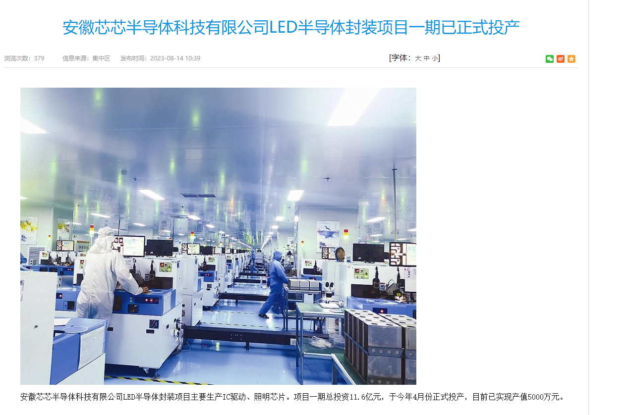据池州市人民政府门户网站显示,安徽芯芯半导体科技有限公司LED半导体封装项目主要生产IC驱动、照明芯片。项目一期总投资11.6亿元,于今年4月份正式投产,目前已实现产值5000万元。