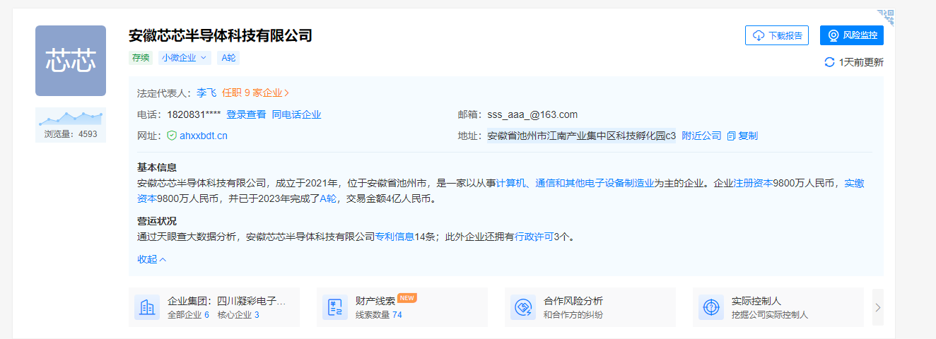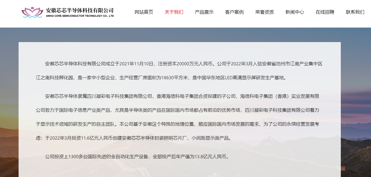 据公开资料,安徽芯芯半导体科技有限公司是一家以从事计算机、通信和其他电子设备制造业为主的企业。其公司成立于2021年11月10日,注册资本20000万元人民币。公司于2022年3月入驻安徽省池州市江南产业集中区江之南科技孵化园,是中国华东地区LED高清显示屏研发生产基地。安徽芯芯半导体隶属四川凝彩电子科技集团有限公司、香港海信科电子集团合资投建的子公司,目前公司全部投产后年产值为13.8亿元人民币。