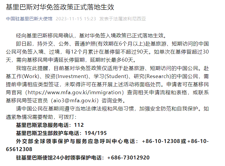 据中国驻基里巴斯大使馆,经向基里巴斯移民局确认,基对华免签入境政策已正式落地生效。