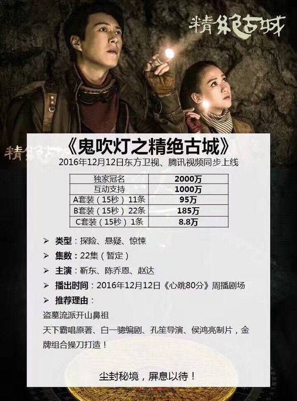 150万不是最高的,据悉目前最高的价格已经奔着上百万去了。但是,中插广告的价格比起动辄过千万的卫视剧场冠名等硬广,还是便宜不少。小娱拿到了一份内部资料,据悉是《精绝古城》在卫视播出的广告报价。