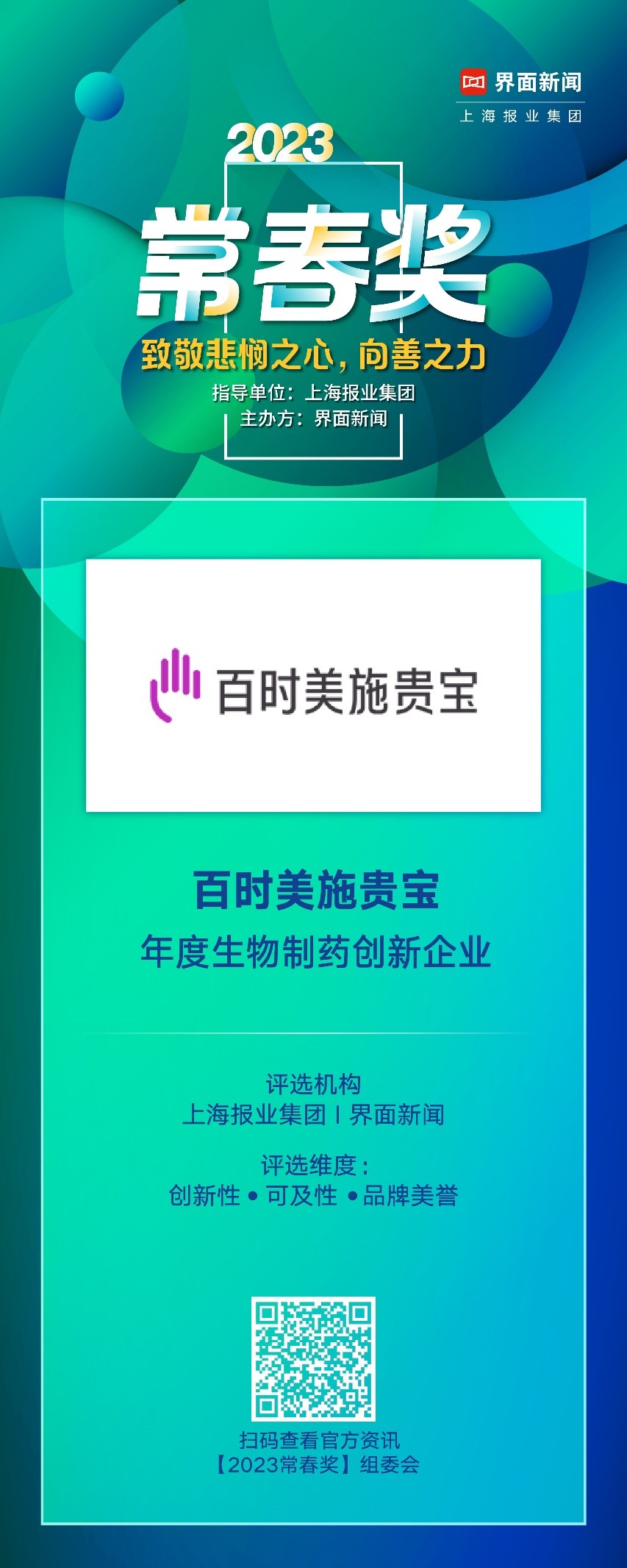 由上海报业集团丨界面新闻主办的2023【常春奖】通过榜单致敬那些心怀悲悯之心,秉持向善之力,为改变人类身心痛苦而埋头进取的公司与个人。