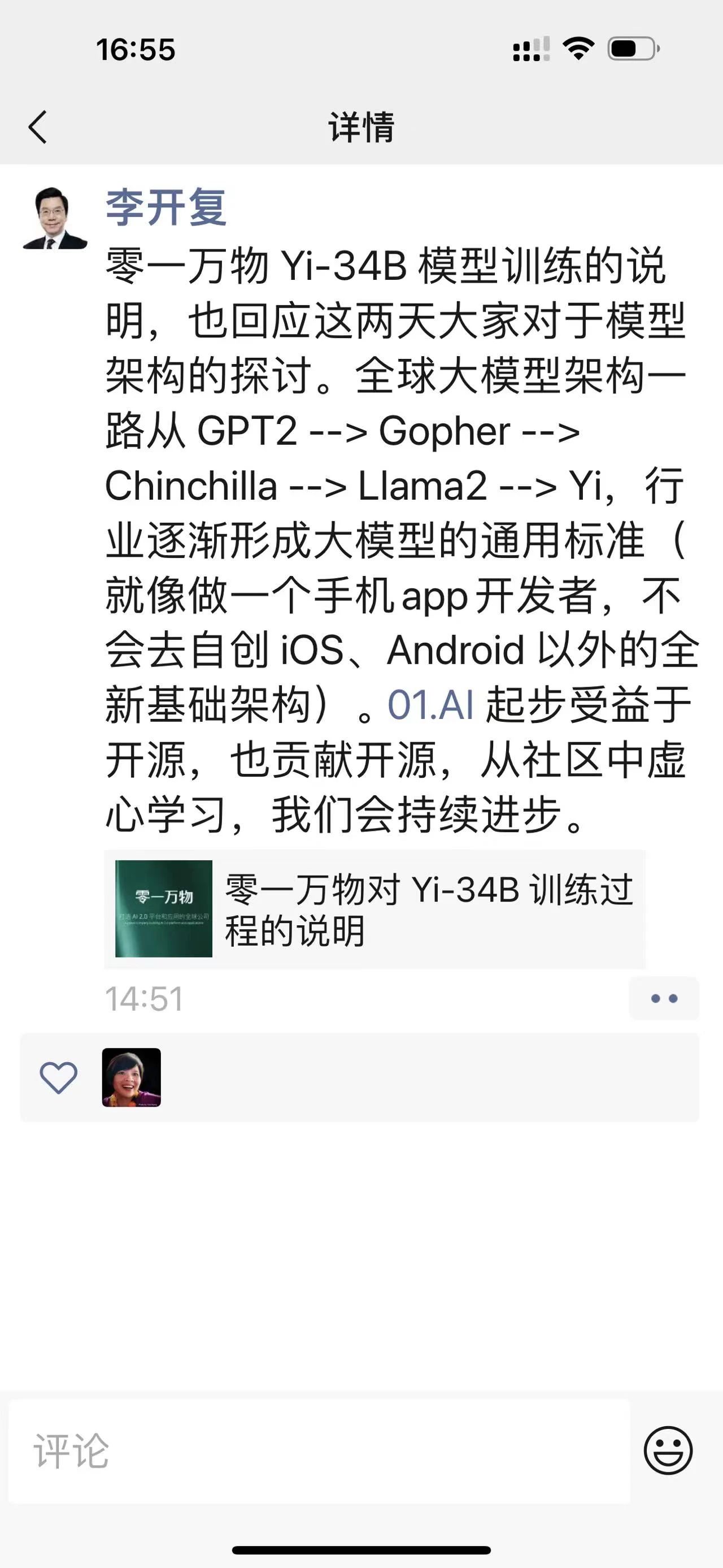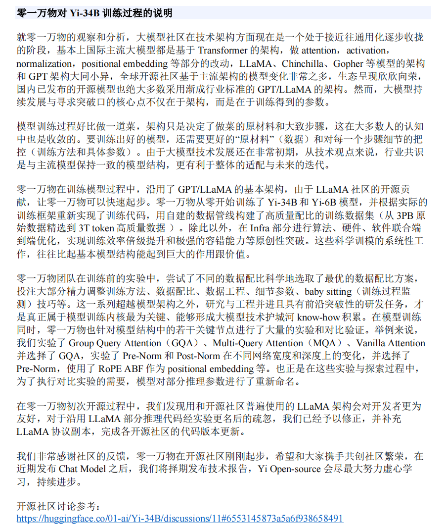 针对外界质疑,11月15日,零一万物在回应盒饭财经中承认,在训练模型过程中,沿用了 GPT/LLaMA的基本架构,但“就零一万物的观察和分析,大模型社区在技术架构方面现在是一个处于接近往通用化逐步收拢的阶段,基本上国际主流大模型都是基于Transformer的架构……国内已发布的开源模型也绝大多数采用渐成行业标准的GPT/LLaMA的架构。”