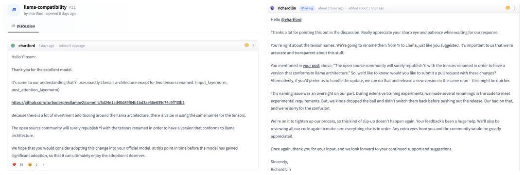 8天后的11月14日,Yi 团队开源总监Richard Lin在该帖下回复称,哈特福德对张量名称的看法是正确的,零一万物将把它们从Yi重命名为Llama。