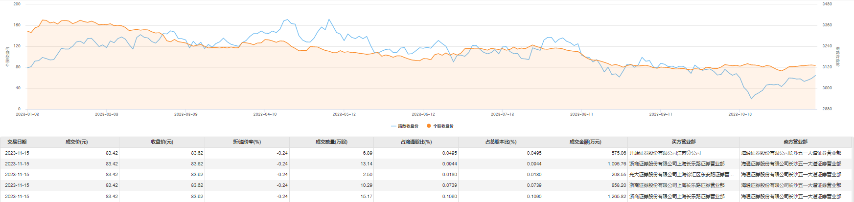 11月15日,金博股份今日大宗交易成交47.99万股,成交额4003.39万元,占当日总成交额的21.03%,成交价83.42元,较市场收盘价折价0.24%。