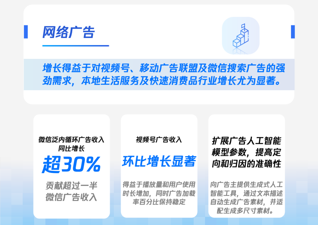 微信的泛内循环广告收入,也就是以小程序、视频号、公众号和企业微信为落地页的广告,同比增长超过30%。最终,网络广告在腾讯业绩中的占比也小幅度提升。