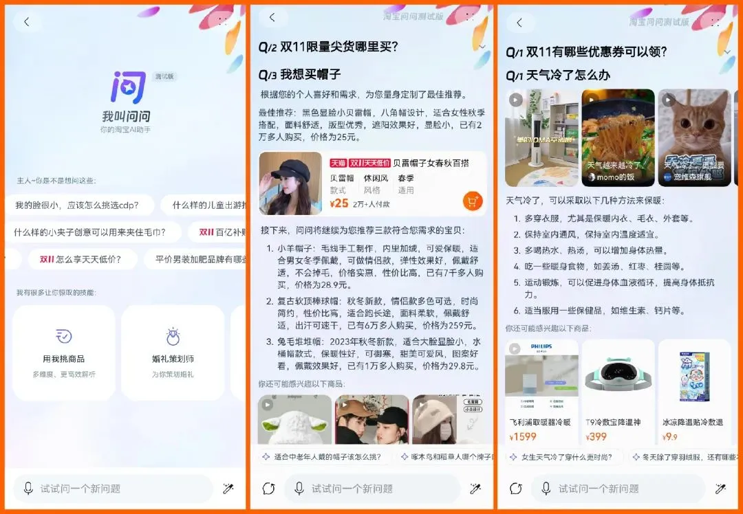 比如淘宝在今年9月推出了生成式AI应用“淘宝问问”,用以帮消费者实现决策推理和规划,今年双十一期间,在原有“指令模式”“问答模式”之外又上线了“大促模式”,可以从品牌偏好、消费预算、功能需求等多维度理解用户需求,并出具一份选购建议。