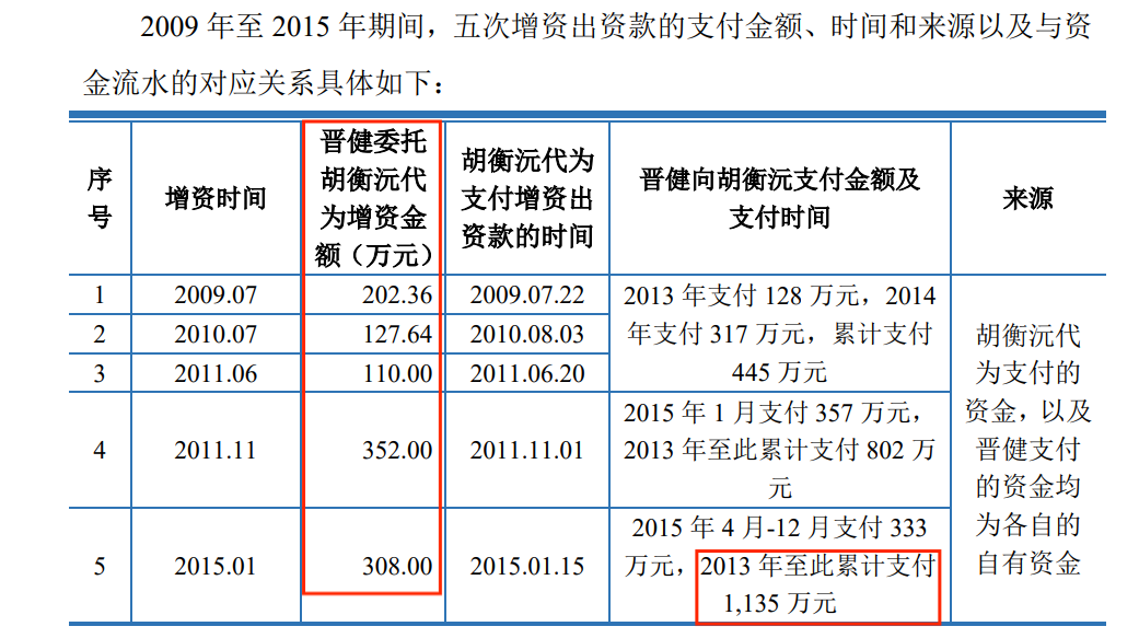 不过,「子弹财经」注意到,这笔资金起初并非是由晋健支付,而是胡衡沅代为支付,晋健的股权也由胡衡沅代持。从2013年开始,晋健才陆陆续续将资金偿还予胡衡沅,累计支付1135万元,包括股权代持款本金和资金占用补偿款。