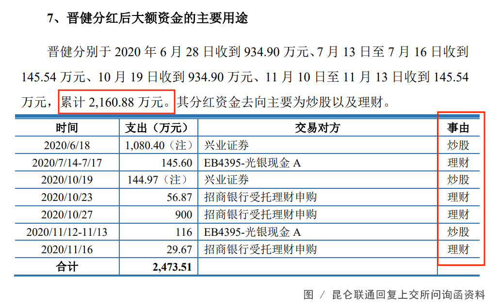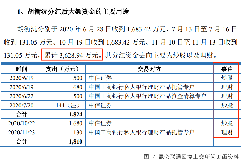 但在回复上交所的资料显示,胡衡沅、晋江在分得高额现金分红后,均拿出超千万资金用来理财、炒股。