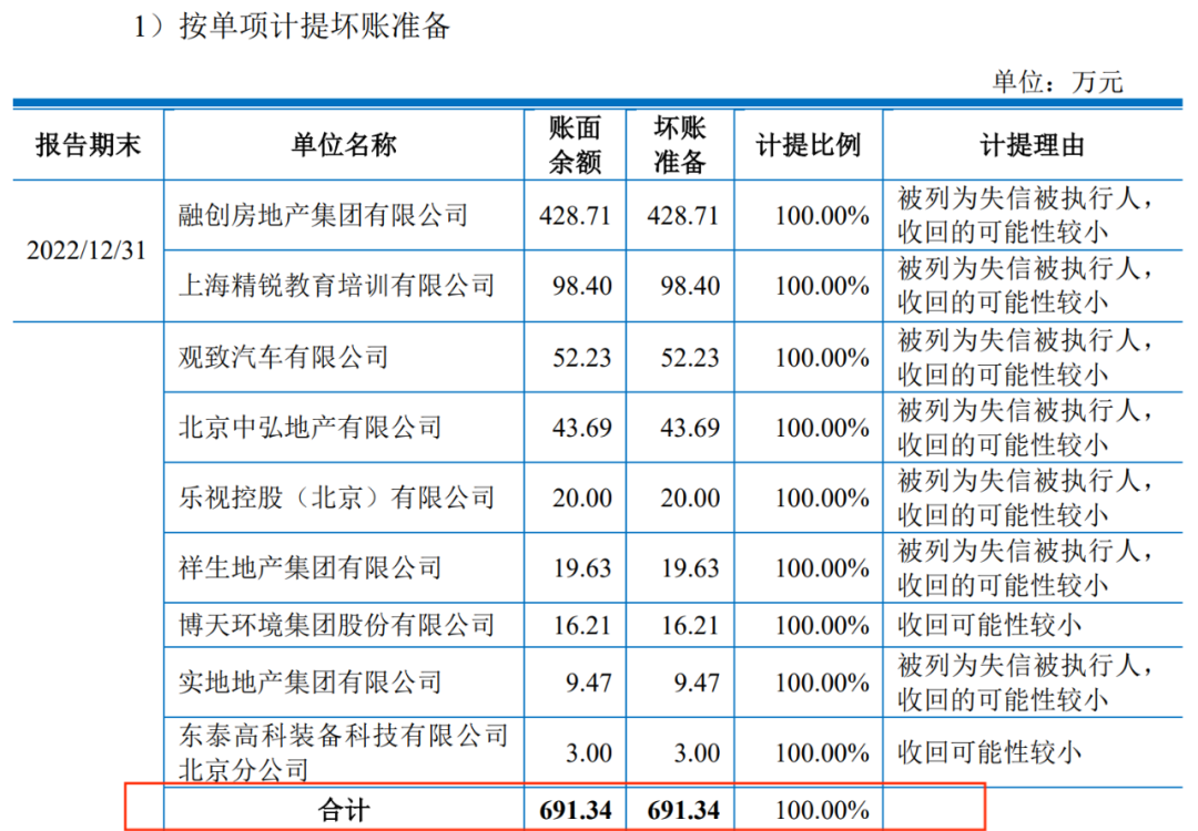 截至2022年12月31日,上述企业应收账款余额691.34万元,公司已100%计提坏账。