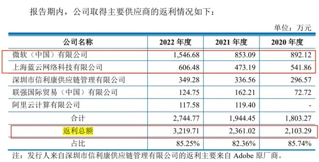 2020年-2022年,公司获得供应商返利2103.29万元、2361.02万元、3219.71万元。其中,来自微软的返利分别为892.12万元、853.09万元、1546.68万元。