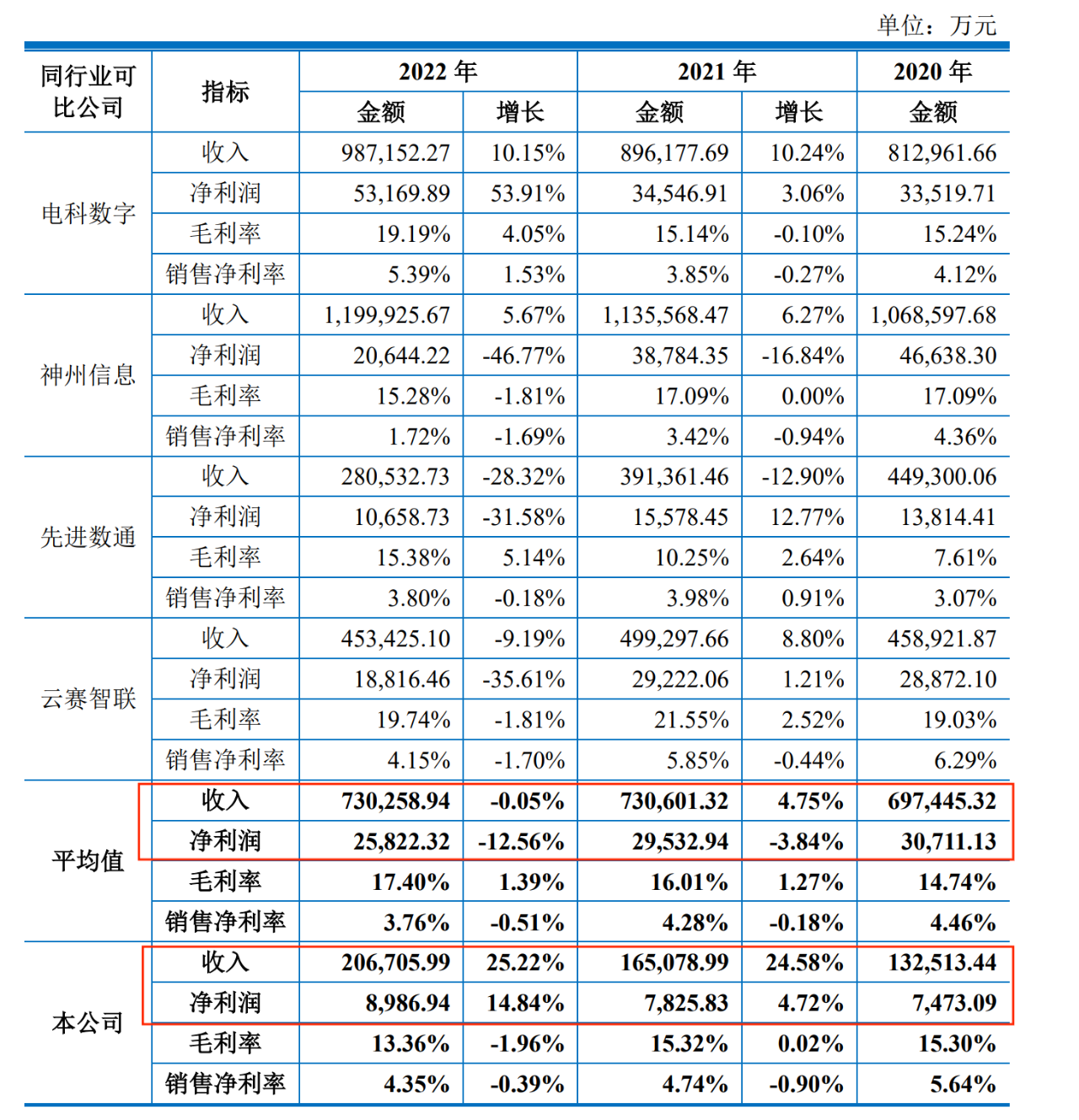 上述同期,同行可比公司营收平均值分别为69.74亿元、73.06亿元、73.03亿元;净利润平均值分别为3.07亿元、2.95亿元、2.58亿元。
