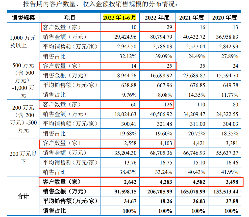 2022年至2023年前6月期间,销售规模为1000万元以上的客户从29家下滑至10家;500万元至1000万元的客户从25家下滑至14家。