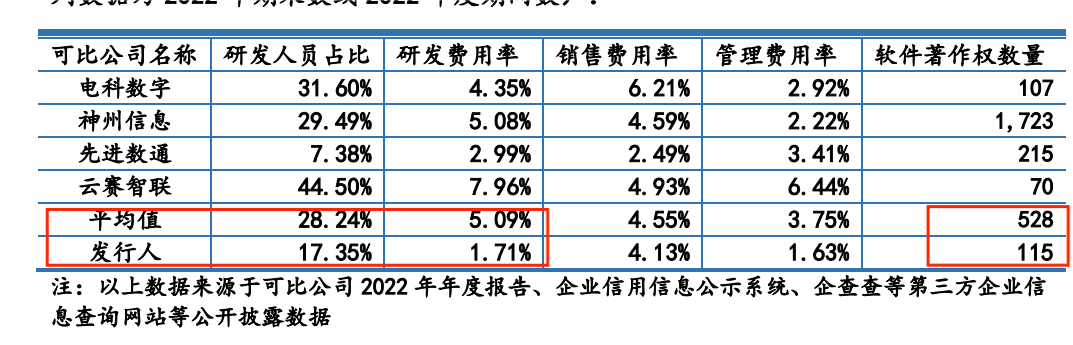 于2022年末,昆仑联通的研发人员占比17.35%,软件著作权数量为115件,同行业可比公司平均值分别是28.24%、528件。