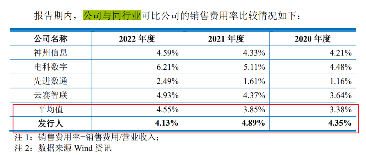2020年-2022年,昆仑联通的销售费用率分别为4.35%、4.89%、4.13%,同行业可比公司平均值则为3.38%、3.85%、4.55%。
