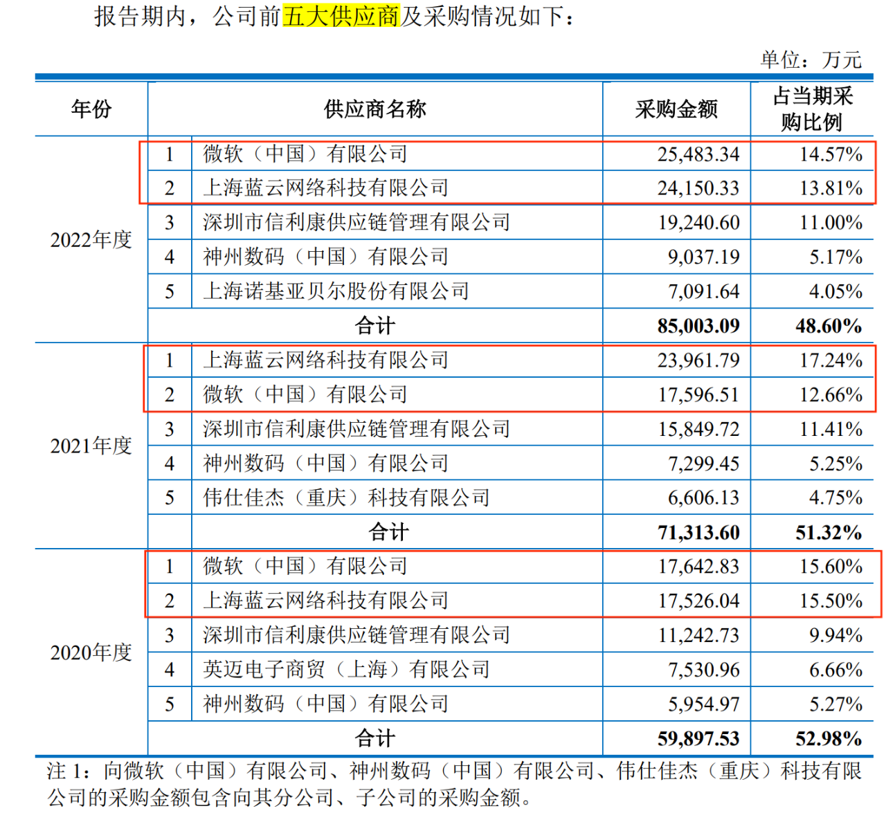 招股书显示,2020年-2022年,微软和蓝云网络合计的采购金额分别为3.52亿元、4.16亿元、4.96亿元,占当期采购比例的31.1%、29.9%、28.38%。