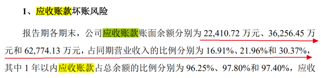 招股书显示,2020年-2022年,公司应收账款账面余额分别为2.24亿元、3.63亿元、6.28亿元,占同期营业收入的比例分别为16.91%、21.96%、30.37%。