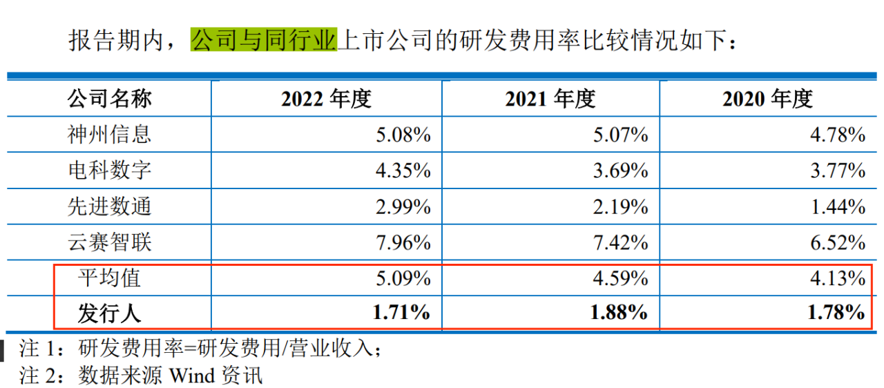 2020年-2022年,昆仑联通的研发费用率分别为1.78%、1.88%、1.71%,同行业可比公司平均值则为4.13%、4.59%、5.09%。