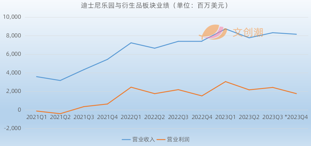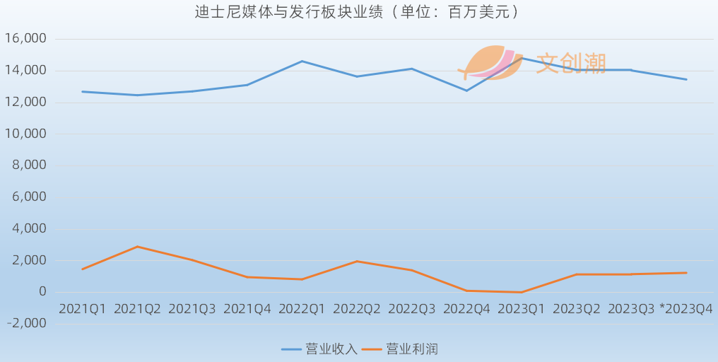 文创潮(微信:IPtide)这里再将迪士尼的娱乐和体育两个板块收入和运营利润数字相加,与此前披露的媒体与发行板块进行纵向对比。