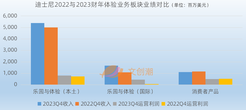 2023财年,迪士尼的体验业务收入同比增长16%,运营利润同比增长23%。与此形成鲜明对比的是,娱乐和体育业务运营利润分别下滑32%和9%。