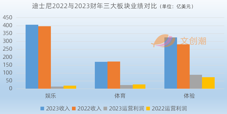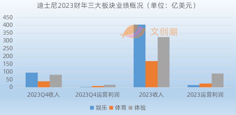 2023财年,迪士尼的娱乐、体育、体验三大业务板块,收入分别为406.35亿、171.11亿、325.49亿美元,运营利润则分别为14.44亿、24.65亿、89.54亿美元。