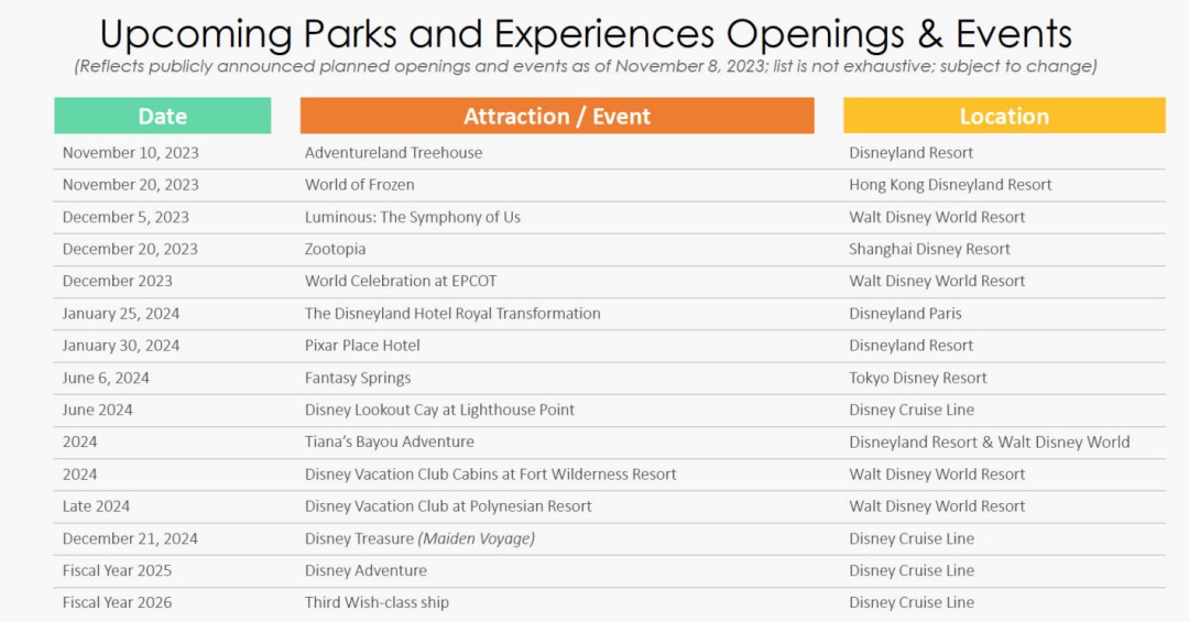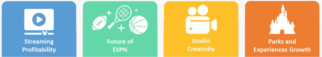 “在流媒体业务中实现显著且持续的盈利能力”,“将ESPN打造成卓越的数字体育平台”,“提高影视工作室的产量和经济效益”,以及“推动我们乐园和体验业务的增长”。