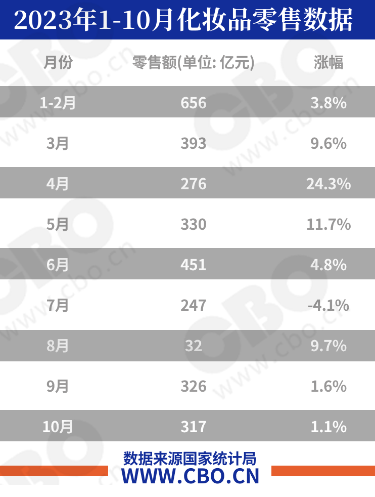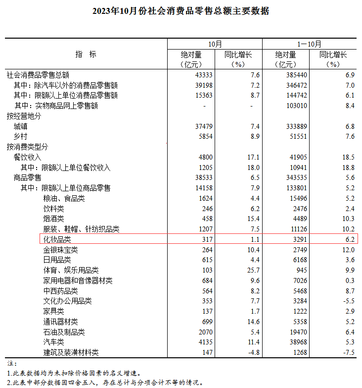 化妆品零售数据方面,1-10月份总零售额为3291亿元,同比上涨6.2%。10月份单月零售额为317亿元,同比上涨1.1%,增速低于大盘,且环比9月下滑2.8%。