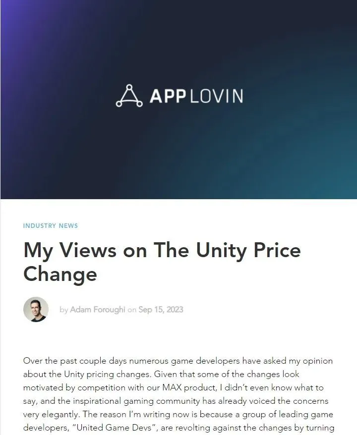 有趣的是,9月15日,在声讨Unity的浪头正劲的时候,AppLovin 的CEO Adam Foroughi给Unity当时的CEO John Riccitiello写了一封公开信。